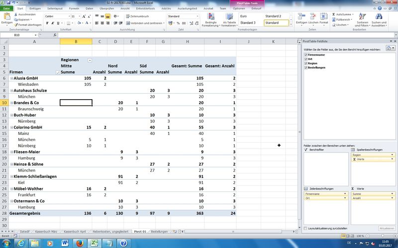 Gruppierte Bereiche (in Zeilen und/oder Spalten) möglich: zusätzlich Zeilen für "Firmenname" mit Feld "Ort" erweitert - also als 2. Zuordnung bei den "Zeilenbeschriftungen" hinzugefügt