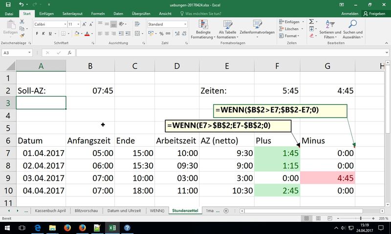 Anm.: negative Zellen (Zahlen kleiner 0) lassen sich nicht in Uhrzeit-Format darstellen -> Einsatz von WENN-Funktion