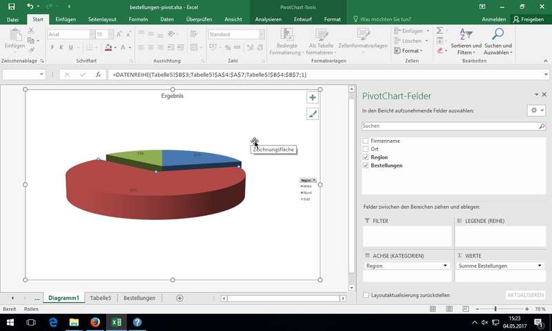 Hinzweis: beim Ändern der Datenbereiche für die PivotTable muss man diese manuell aktualisieren (Kontextmenü oder Schaltfläche Aktualisieren in Ribbon Optionen der PivotTable-Tools