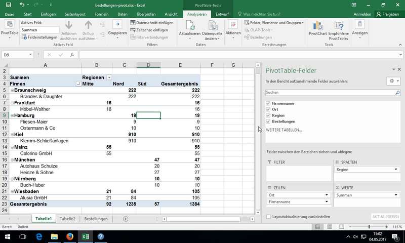 Gruppierte Bereiche (in Zeilen und/oder Spalten) möglich: zusätzlich Zeilen für "Firmenname" mit Feld "Ort" erweitert - also als 2. Zuordnung bei den "Zeilenbeschriftungen" hinzugefügt