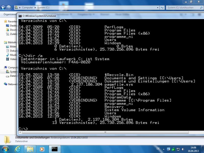 Analyse der Verbindungen/Umleitungen am Beispiel von "Dokumente und Einstellungen", "Documents and Settings" und "Programme"