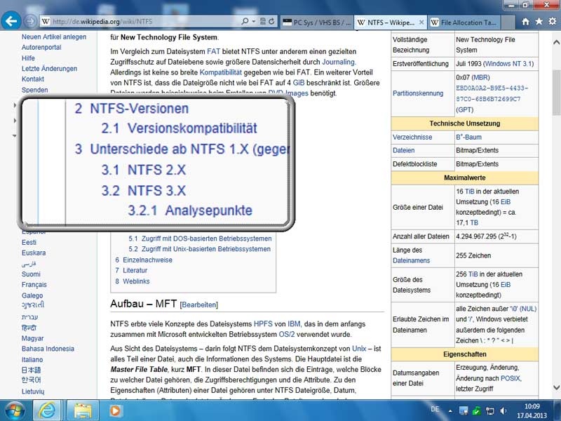 Versionen 6.1 bzw. 3.1 (Hinweis auf Wikipedia-Artikel zum Dateisystem von Microsoft NT-Systemen