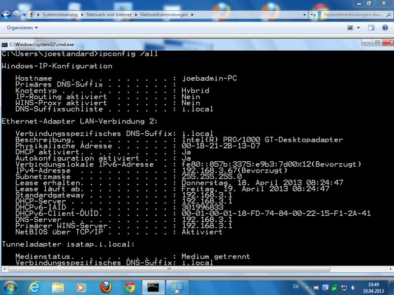 Analyse Netzwerk:ipconfig /all(in der Befehlszeile cmd)