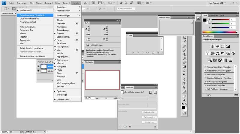 nicht destruktive Anpassung von Helligkeit/Kontrast, Tonwertkorrektur, Gradationskurven, Farbton/Sättigung über die neue Palette "Korrekturen" (klass. Einstellungsebenen), nachträgliche Bearbeitung mittels Doppelklick auf Korrektursymbol in Ebenenpalette, automatische Kombination mit Maske für Korrekturebene; Schnittmaske anwenden, damit Korrekturen nur auf die direkt darunterliegende Ebene wirken - Textwerkzeug (T)