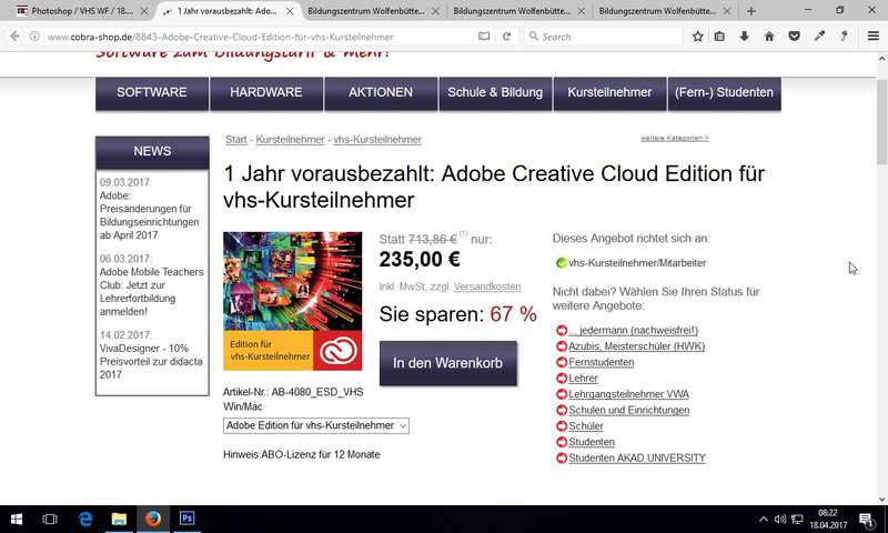 Hinweis auf Adobe-VHS-Lizenzen über den Cobra-Shop (aktuell auch die Creative Cloud für VHS-Teilnehmer im Angebot!) - Photoshop Versionen und Buchresourcen