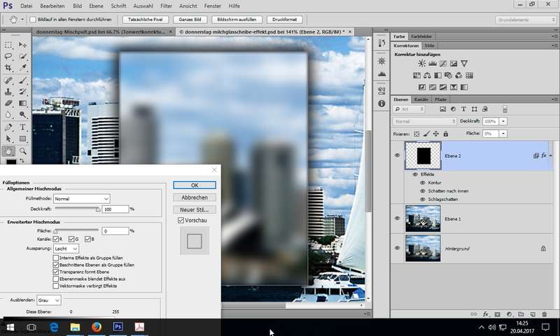 Einsatz des Reglers Fläche (im Unterschied zu Deckkraft) und Effekt einer Glasscheibe herstellen