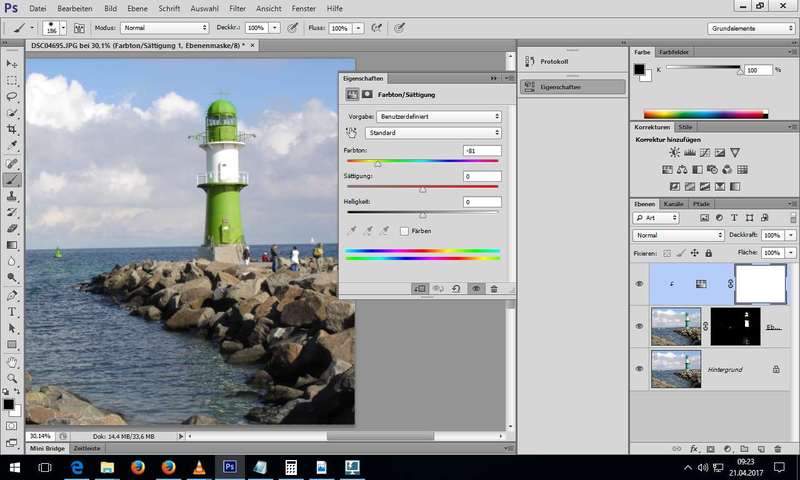 Nutzung von alternativer Maskierungstechnik (Auswahl - Farbbereich...) und Farben wechseln über Einstellungsebene (Korrekturebene) Farbton/Sättigung