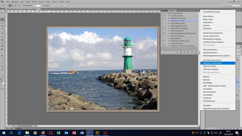 am Beispiel von Standardaktionen "Vignette (Auswahl)" und "Holzrahmen - 50 Pixel" kann man die Palette und Aufbau in Aktionen-Gruppen kennen lernen